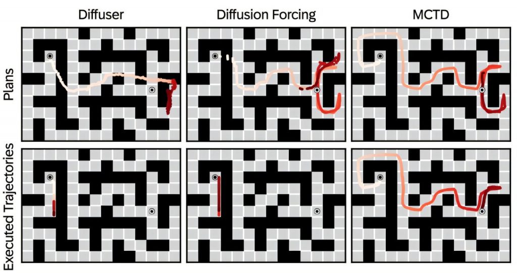 What makes this breakthrough especially exciting is that the new model achieved a 100% success rate in a giant maze-solving task — an area where all previous approaches failed completely. Existing models like Diffuser and Diffusion Forcing struggled to produce viable trajectories, whereas MCTD succeeded by refining its plans in real time using a tree-based search method.